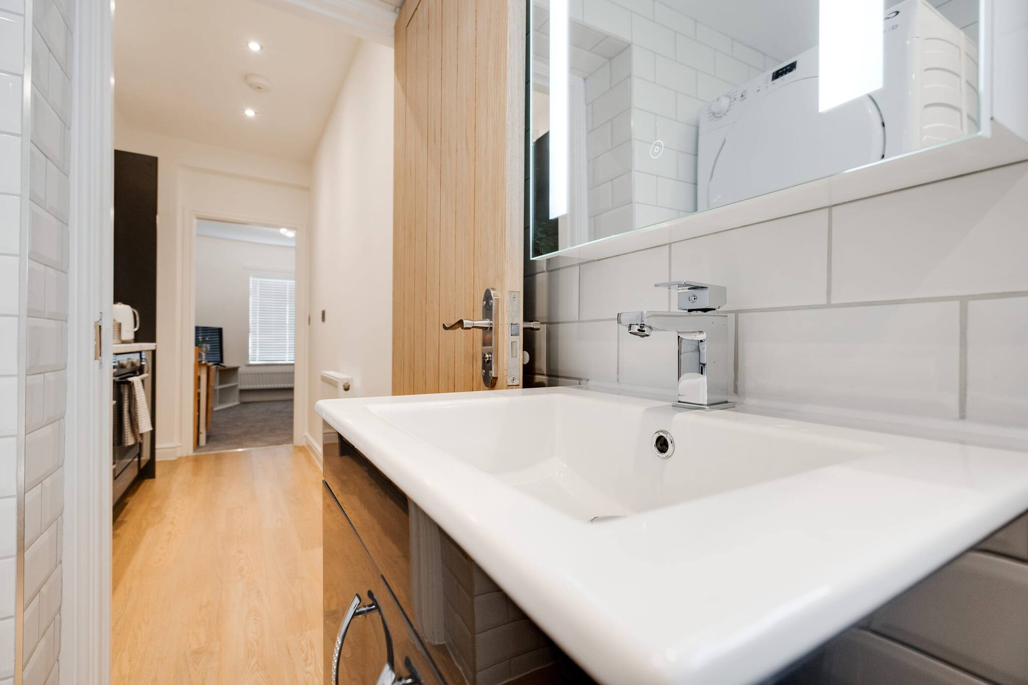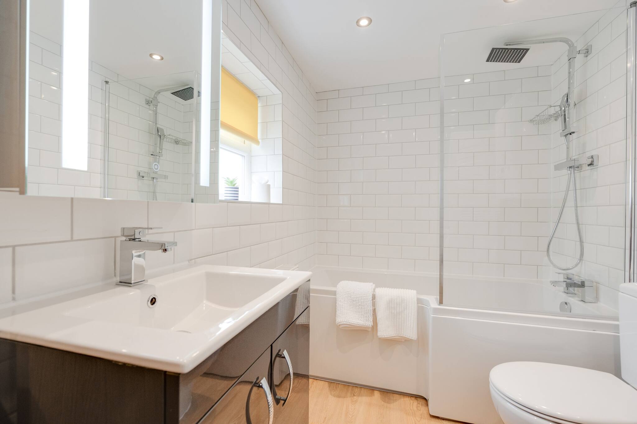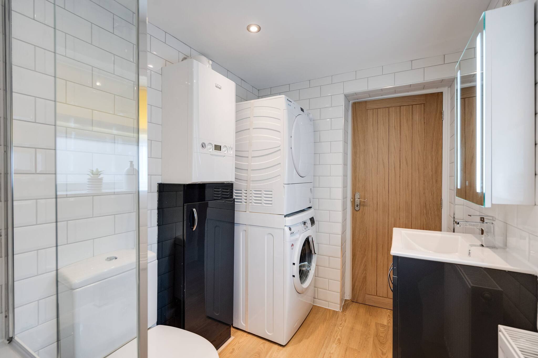 The bathroom has a shower above the bath and modern bold design looks stunning. The bathroom also contains the boiler, washing machine and dryer.