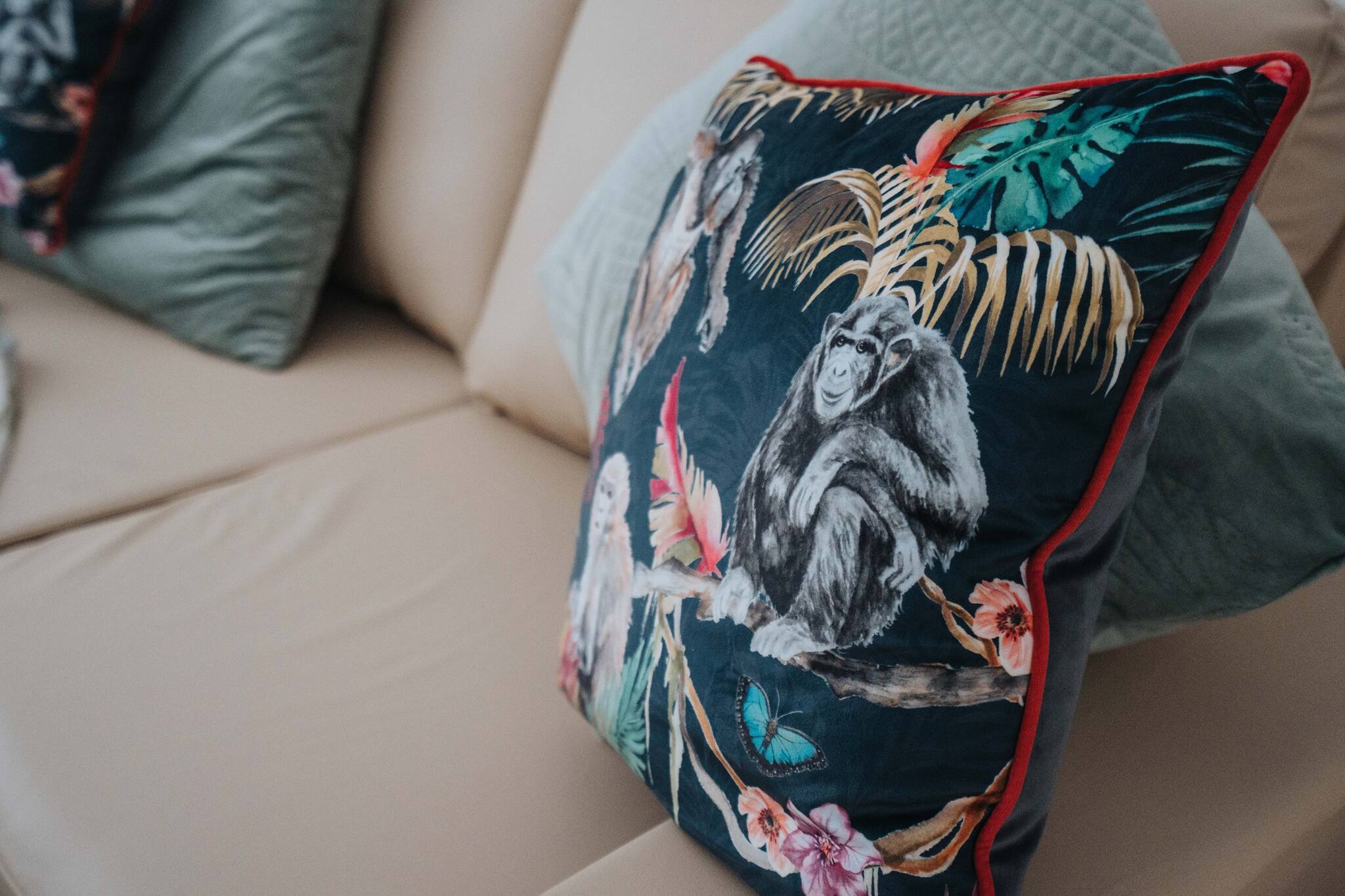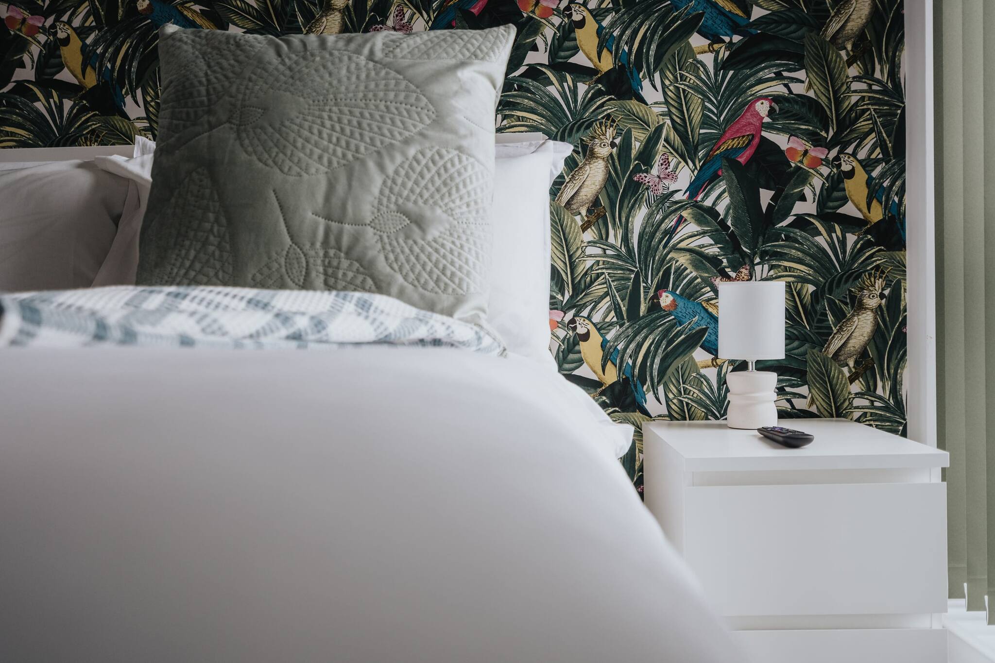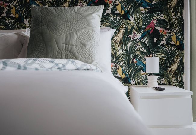 The master bedroom has a comfy double bed, wardrobe for your belonging and a small vanity unit. We absolutely love the wall paper in the bedroom.