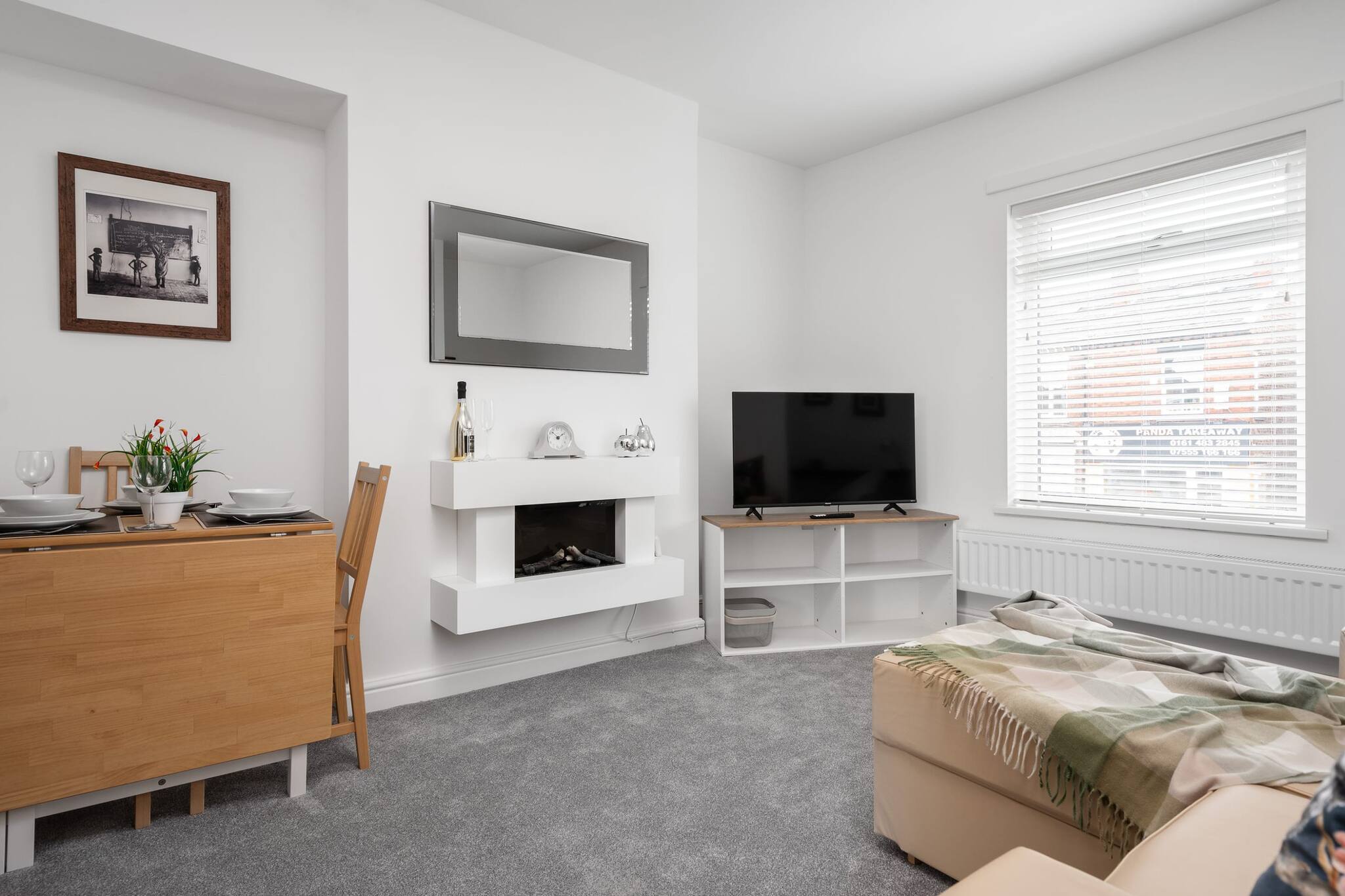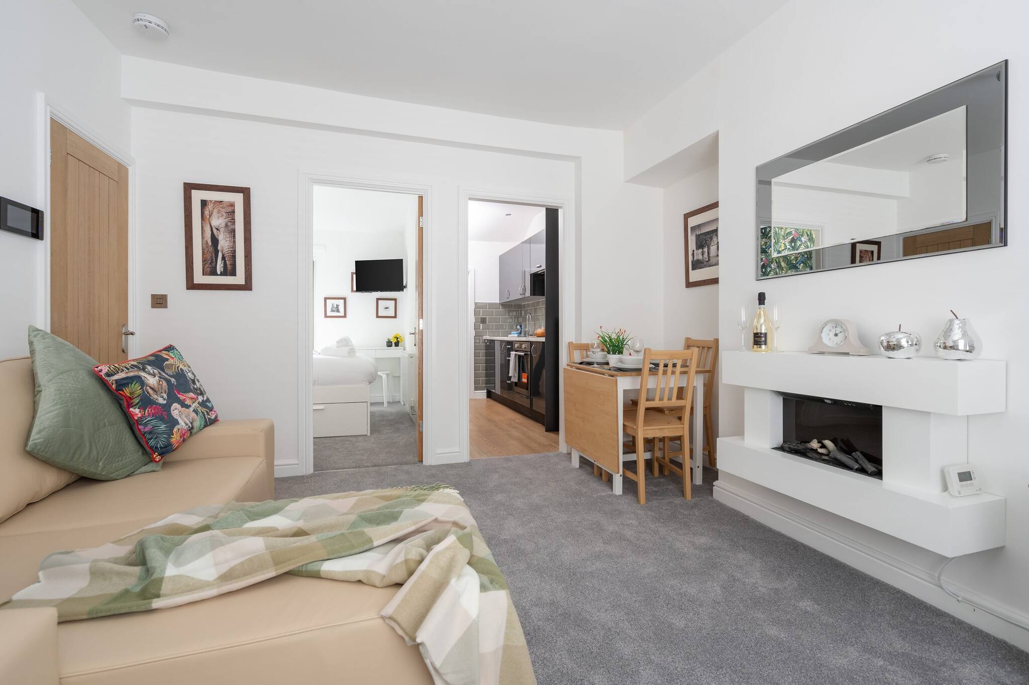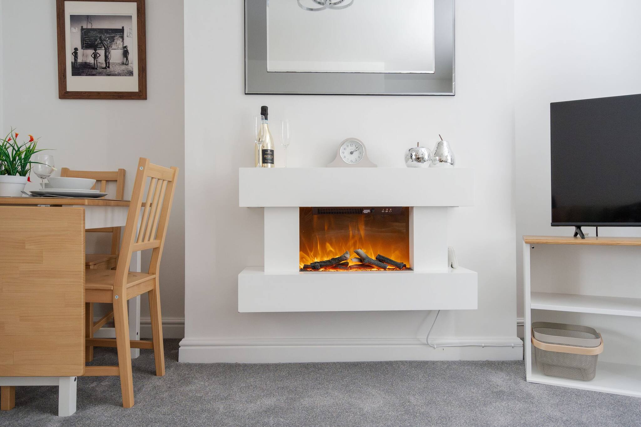There is an open plan lounge, which contains a comfortable sofa bed, dedicated desk, dining table and Smart TV. You're able to sign into the Smart TV with your streaming accounts. There is an electric fire, to provide a snug feeling in the winter if you prefer it to the radiators.