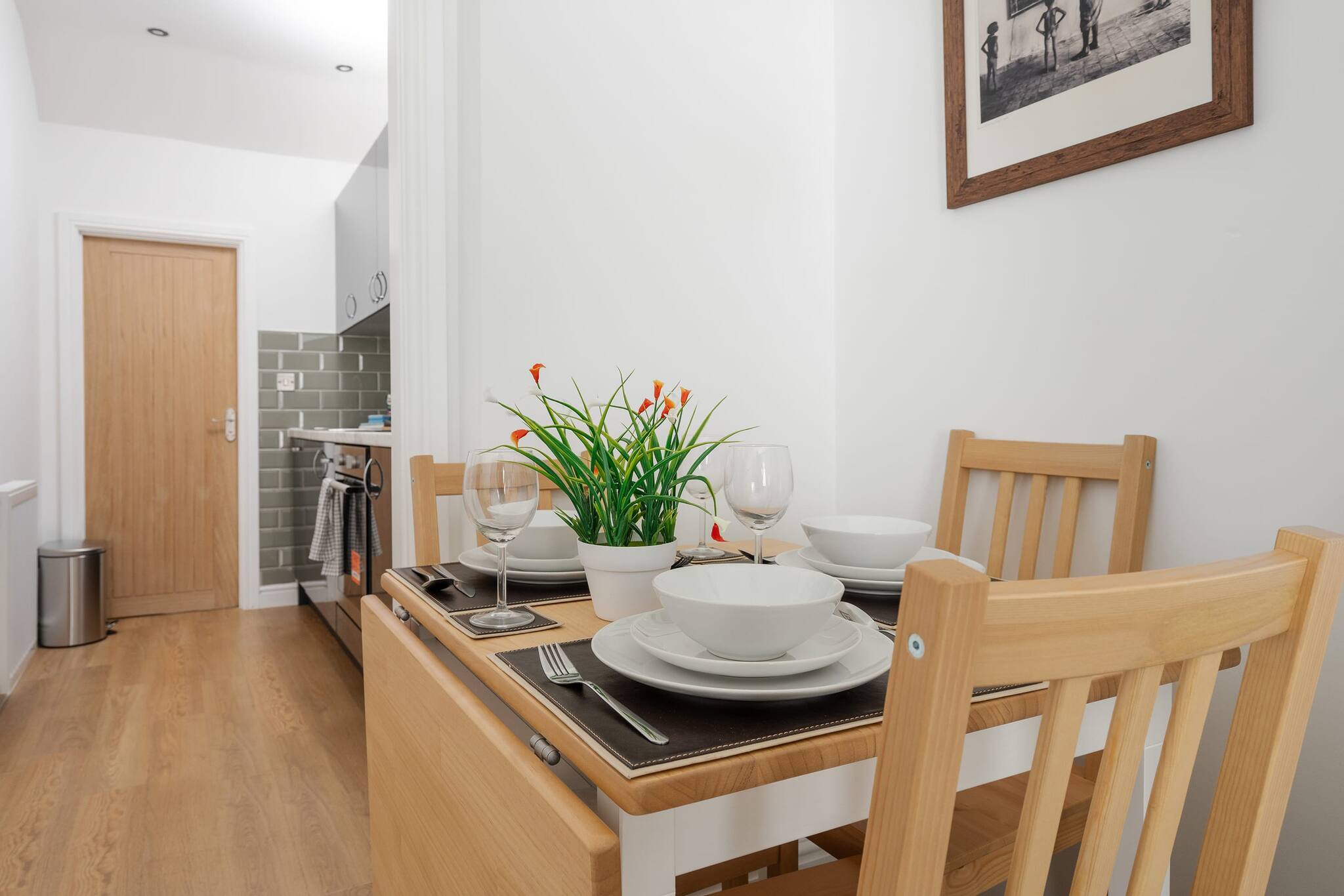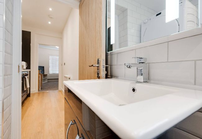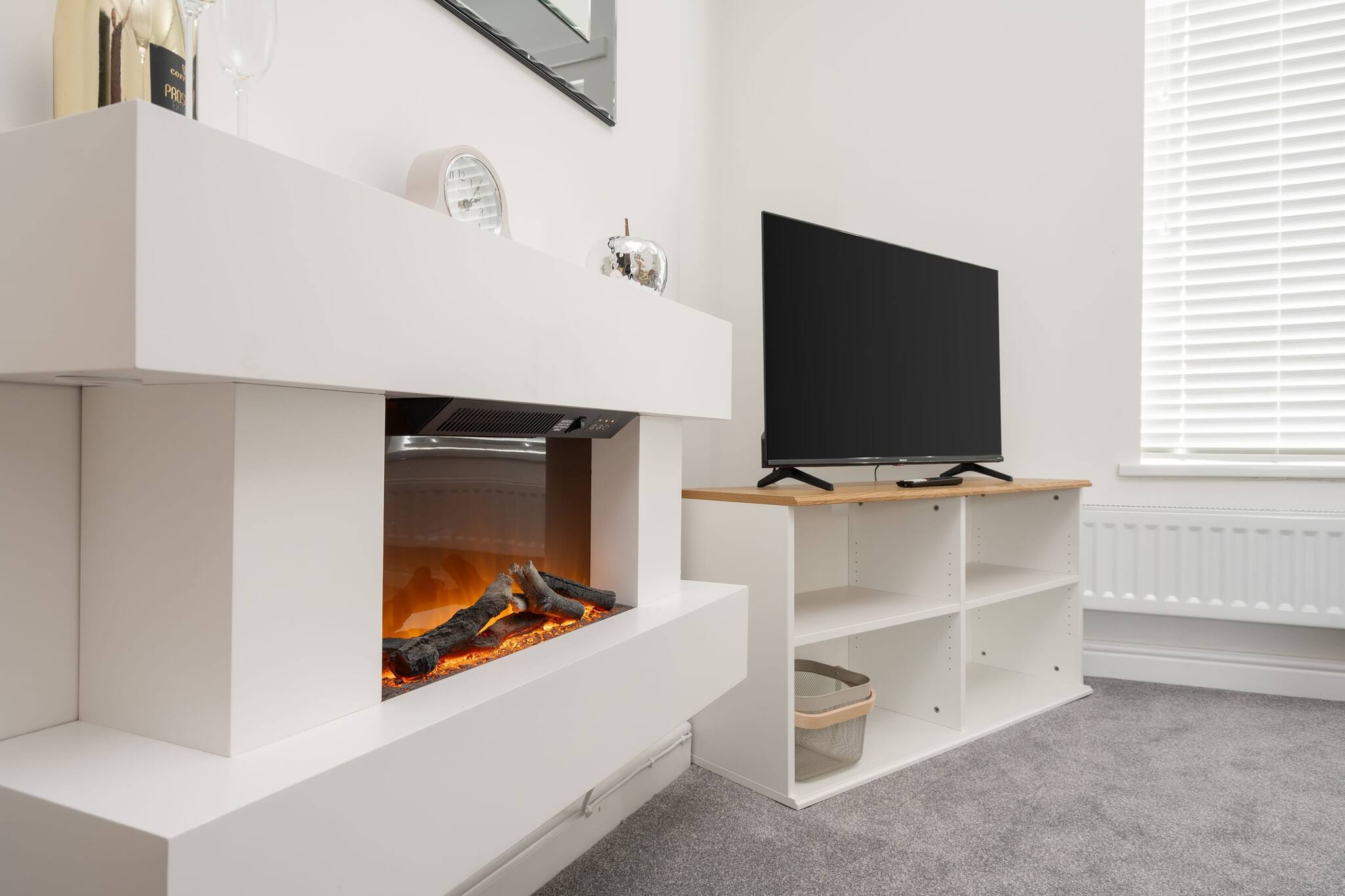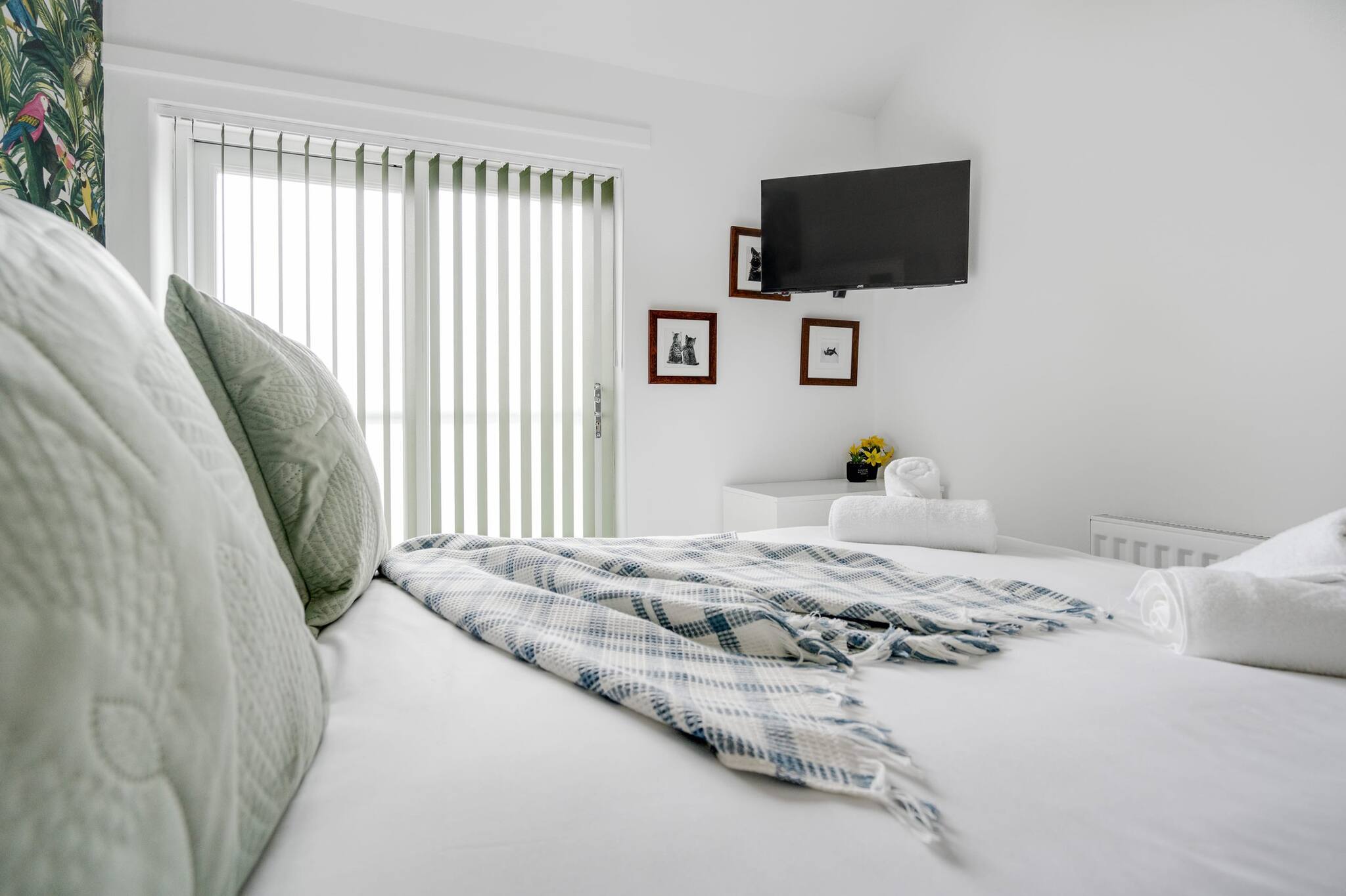 There is an open plan lounge, which contains a comfortable sofa bed, dedicated desk, dining table and Smart TV. You're able to sign into the Smart TV with your streaming accounts. There is an electric fire, to provide a snug feeling in the winter if you prefer it to the radiators.