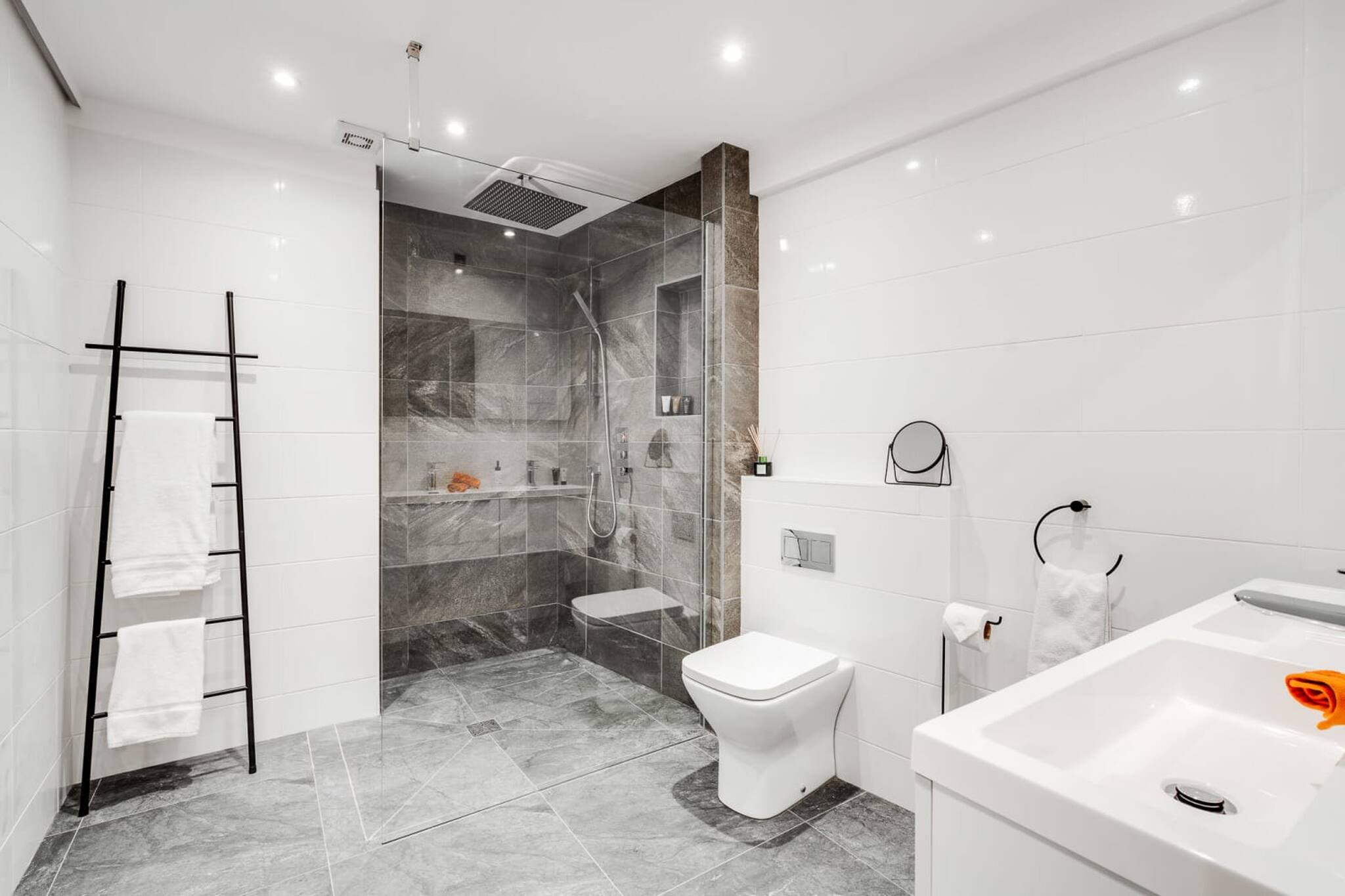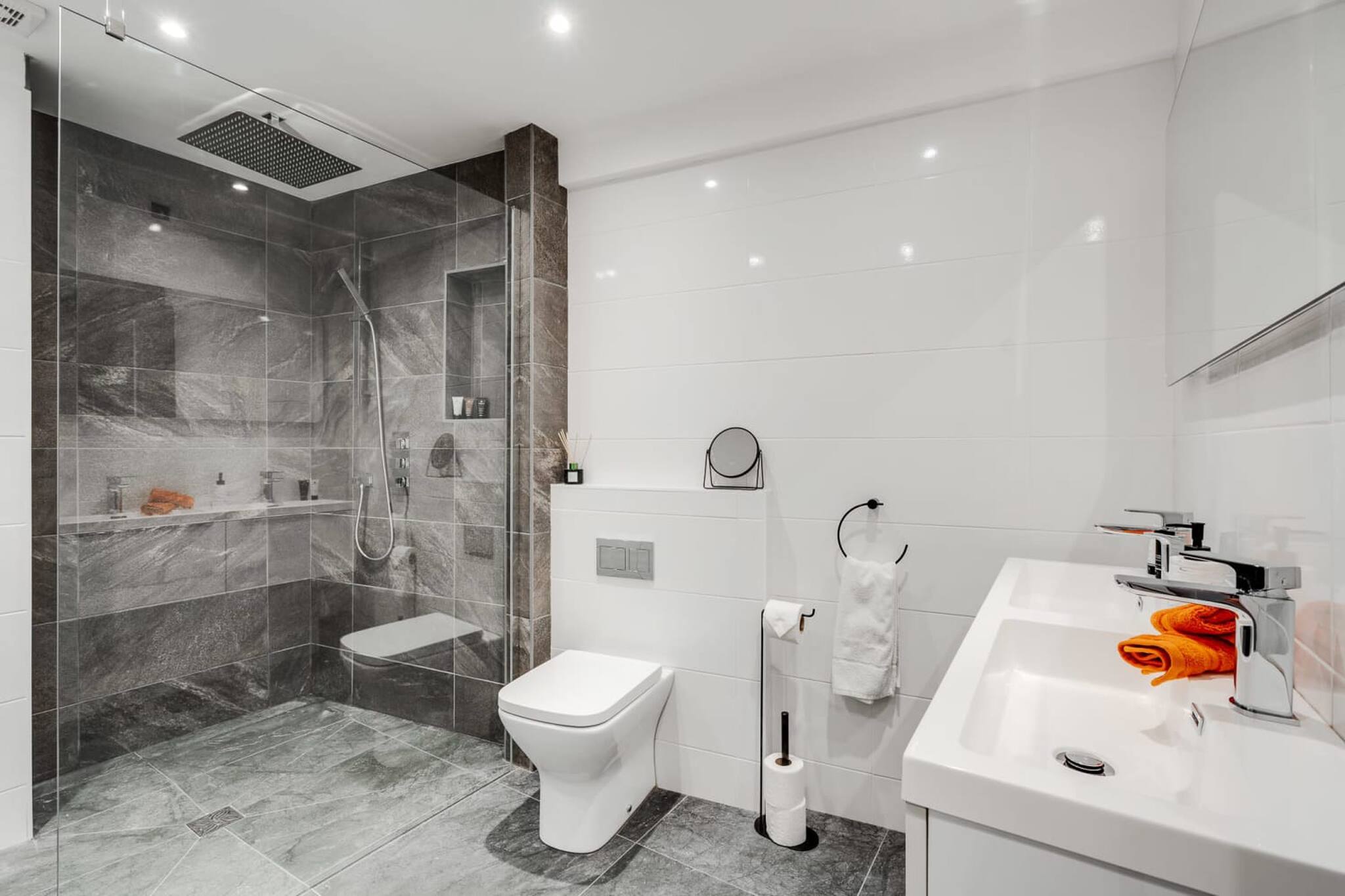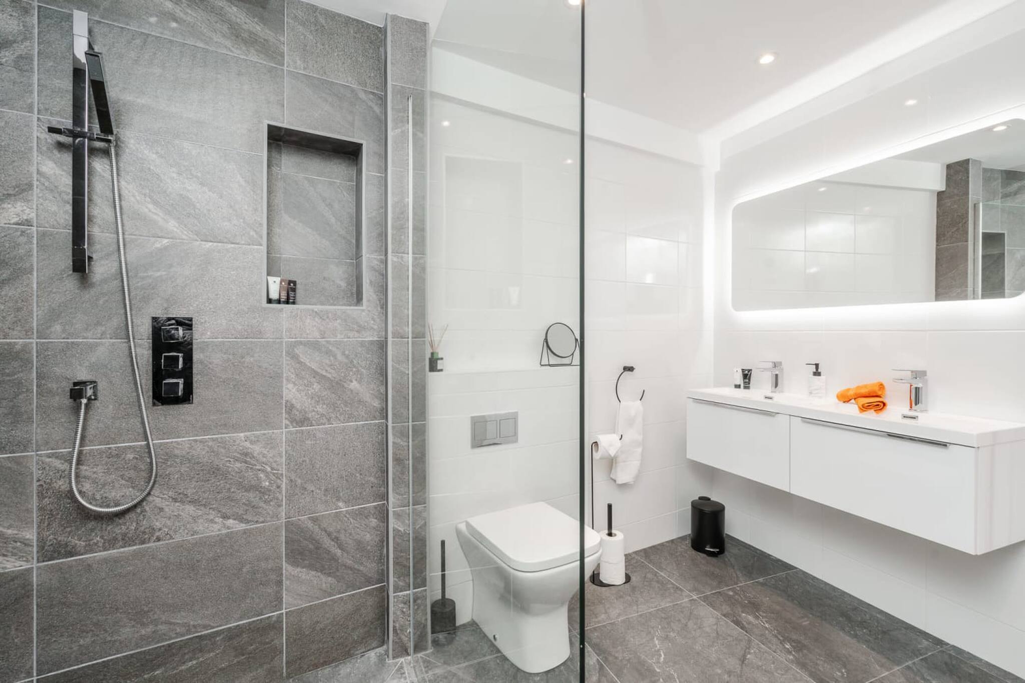 There is a large main bathroom containing a lovely walk-in shower, toilet, sink, and an impressive mirror framed by coloured LED lights. The bathroom also has coloured LEDs built into the ceiling.