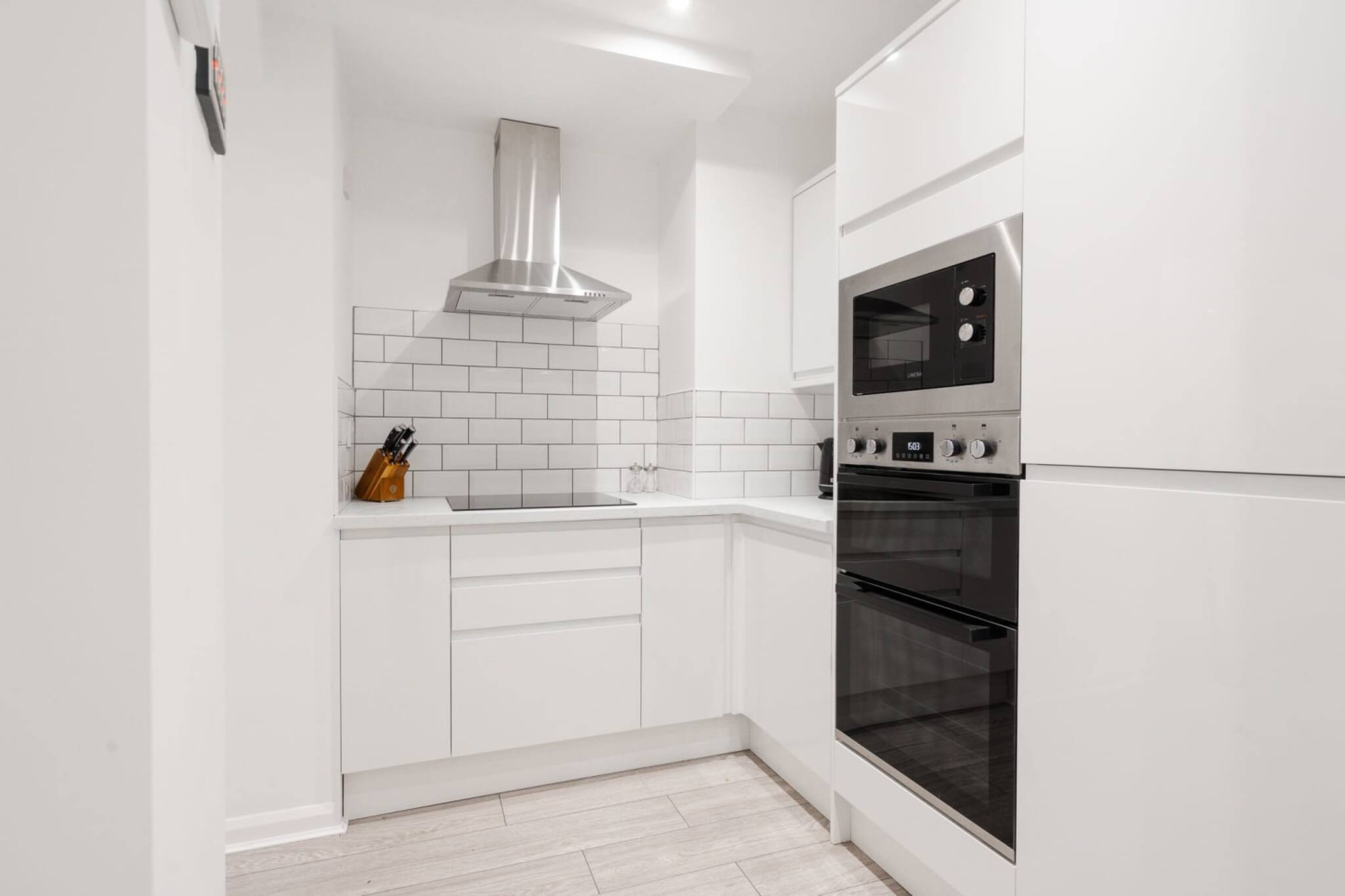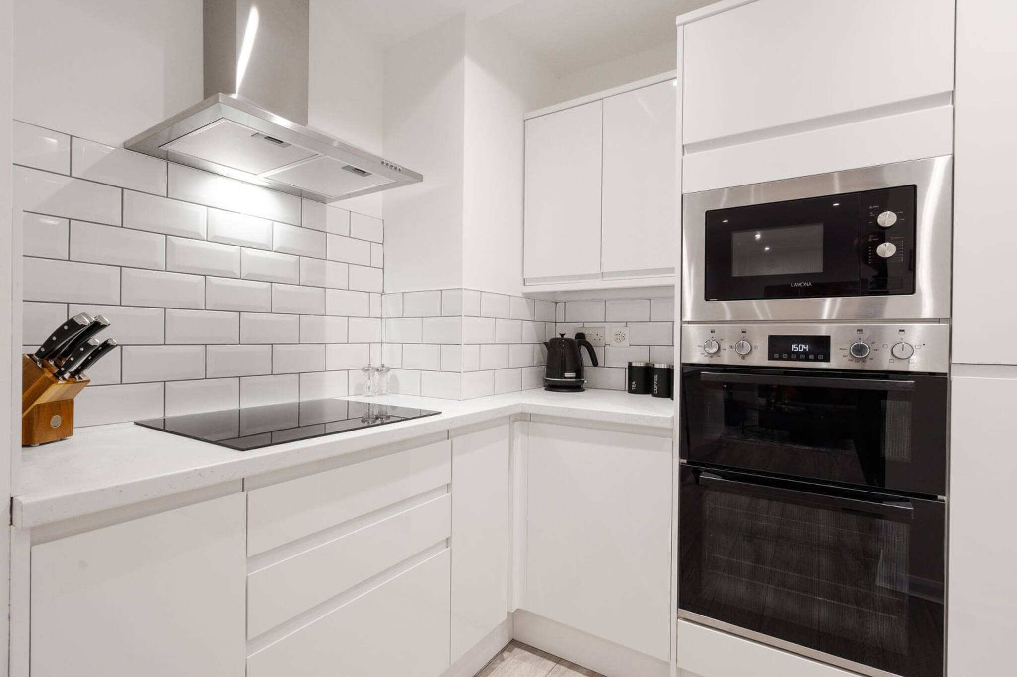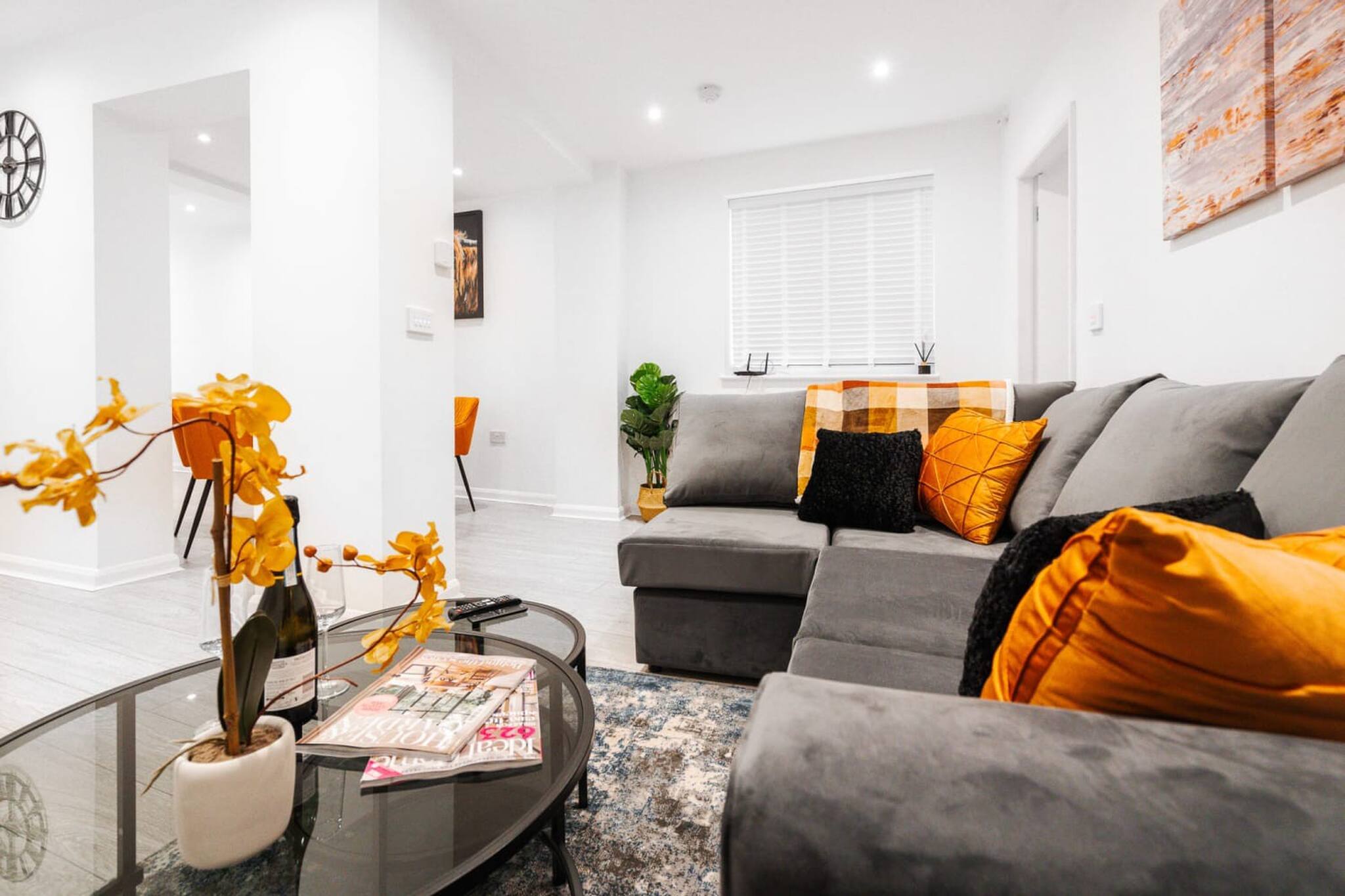 The open plan living room, dining room and kitchen is stunning! There are dining chairs and a table for you to eat at. There is a fully stocked kitchen including cutlery and cookware, so that you're able to prepare meals. The kitchen also contains a microwave, hob and oven, as well as a washing machine and tumble dryer. The lounge area has a comfortable sofa, side tables and a Smart-TV.