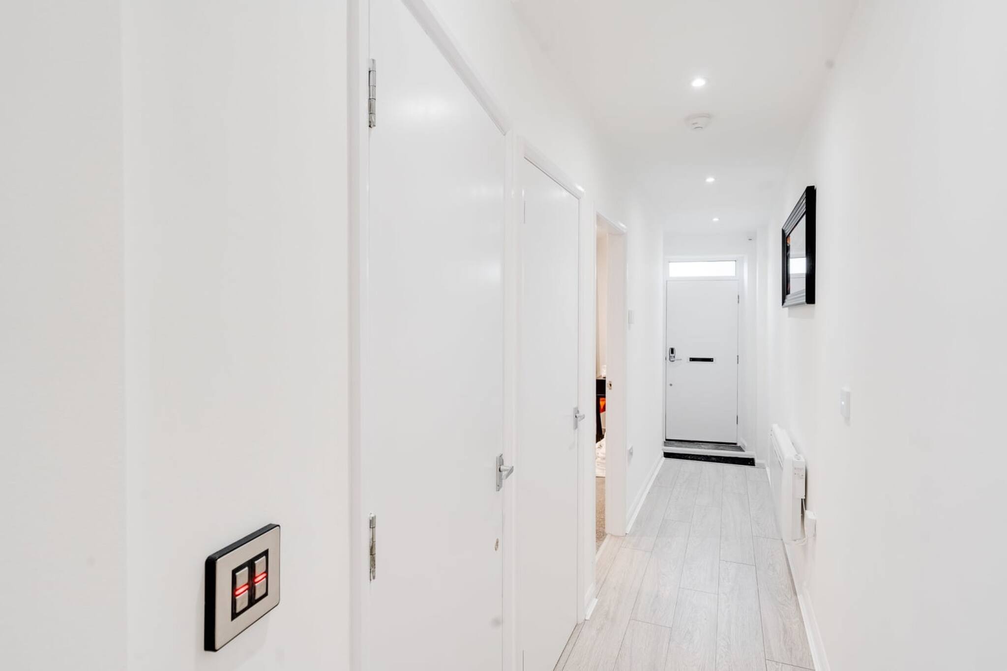 When entering the property, you step into a hallway with a modern control panel that operates electronics and gadgets throughout the apartment.