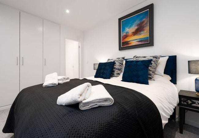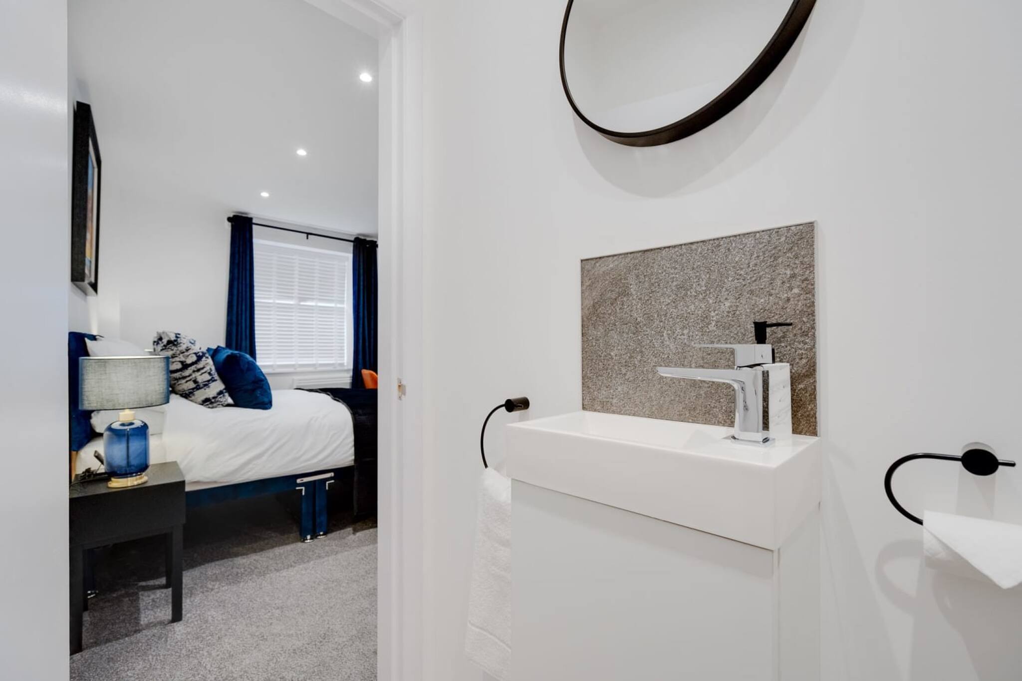 The first room on your right is the master bedroom, which contains a king-size bed, storage space and a desk. Modern décor and furnishings complete the room and it also has a small en-suite, which contains a toilet and sink.