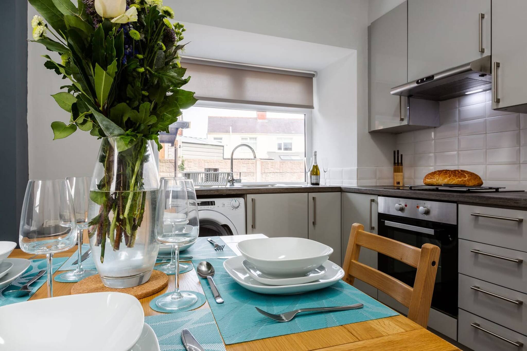 The kitchen has a dining table and chairs for eating at. The kitchen is stocked with all the cooking equipment that you need, it is also stocked with dining sets, cutlery, glasses and cups that you'll need. There is a dryer, washing machine, toaster, microwave, over and stove.