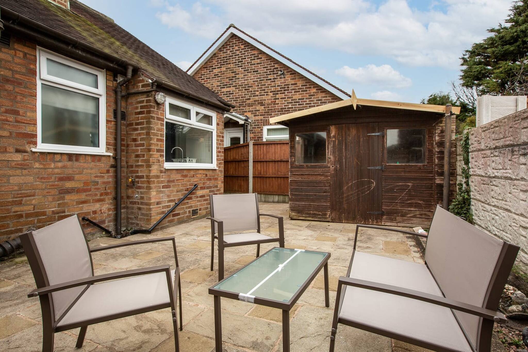 The garden has outdoor furniture and paved areas and gets all the sun in the summer.