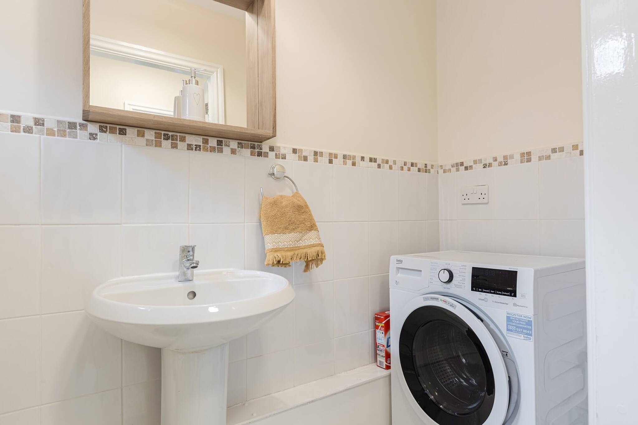 There is a downstairs toilet with a sink and washer/dryer combination.
