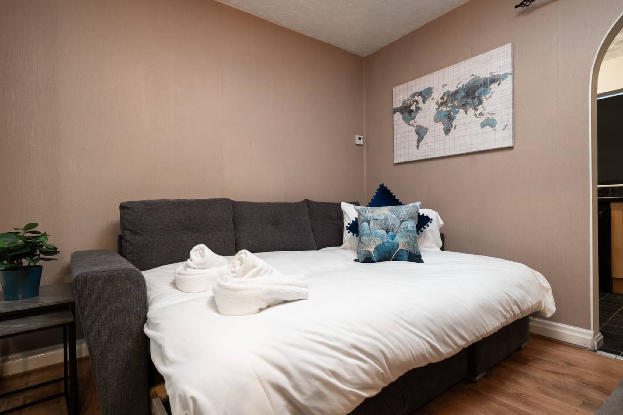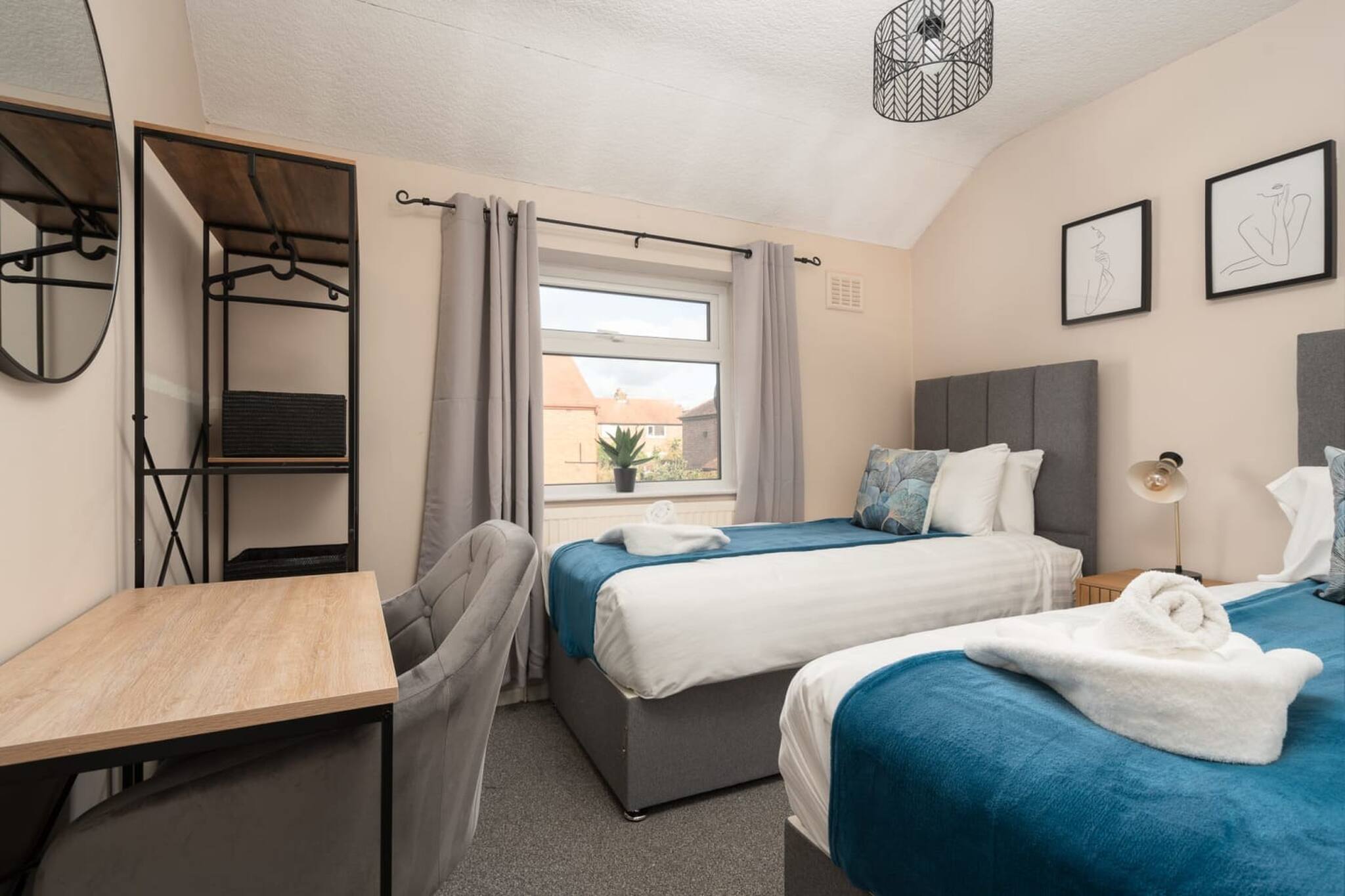 The second bedroom has two single beds are Zip and Link so we can make them into a double for you if required. There is a small desk and storage for your belongings.
