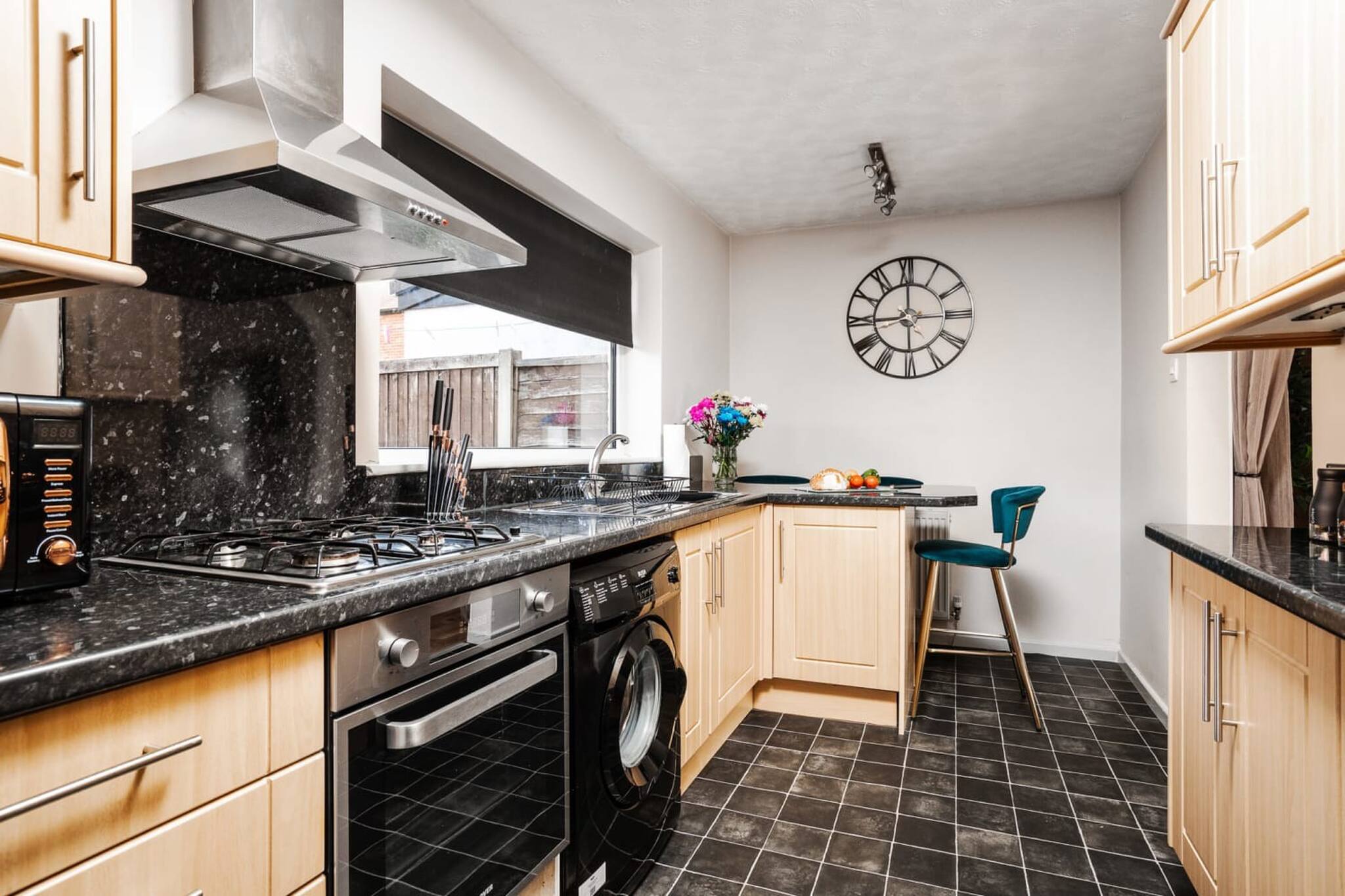 There is an archway that leads you into the kitchen. There is a breakfast bar to sit at if you don't want to use the dining table. The kitchen contains a washing machine, fridge/freezer, kettle, toaster, microwave and all the dining ware and cooking equipment that you would need to prepare a meal.