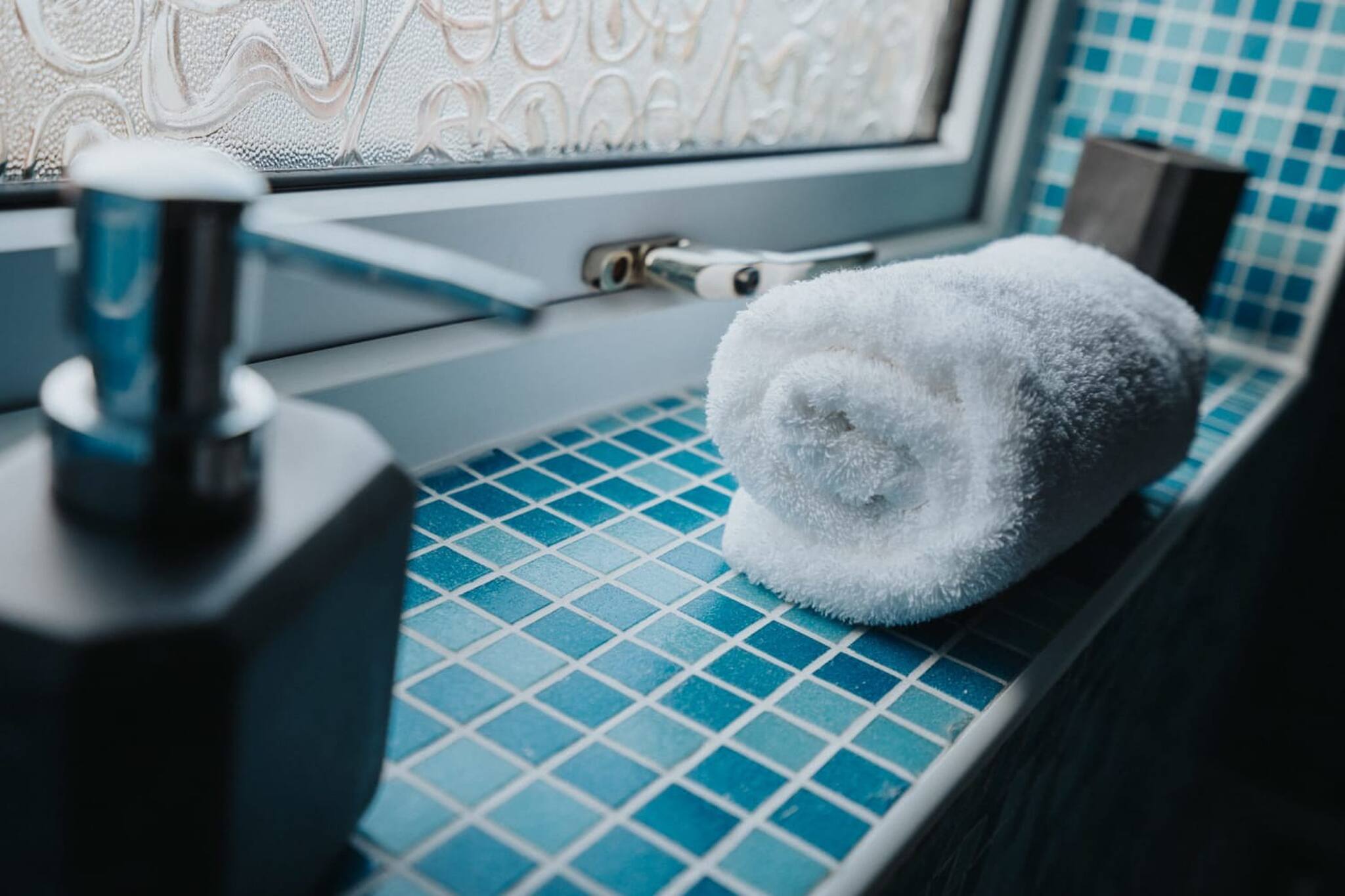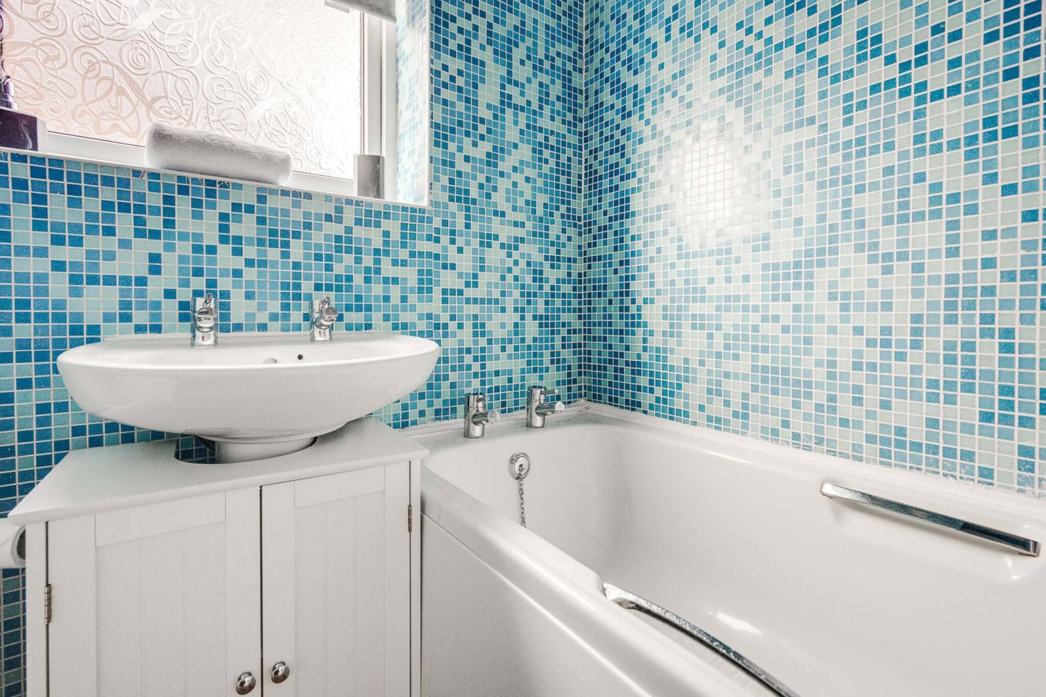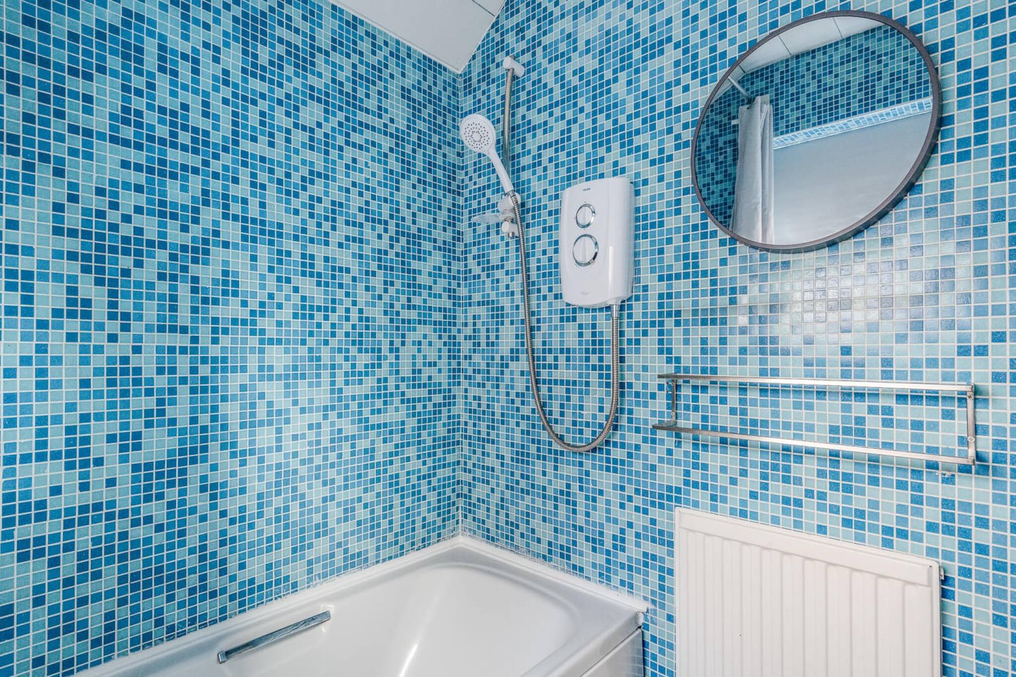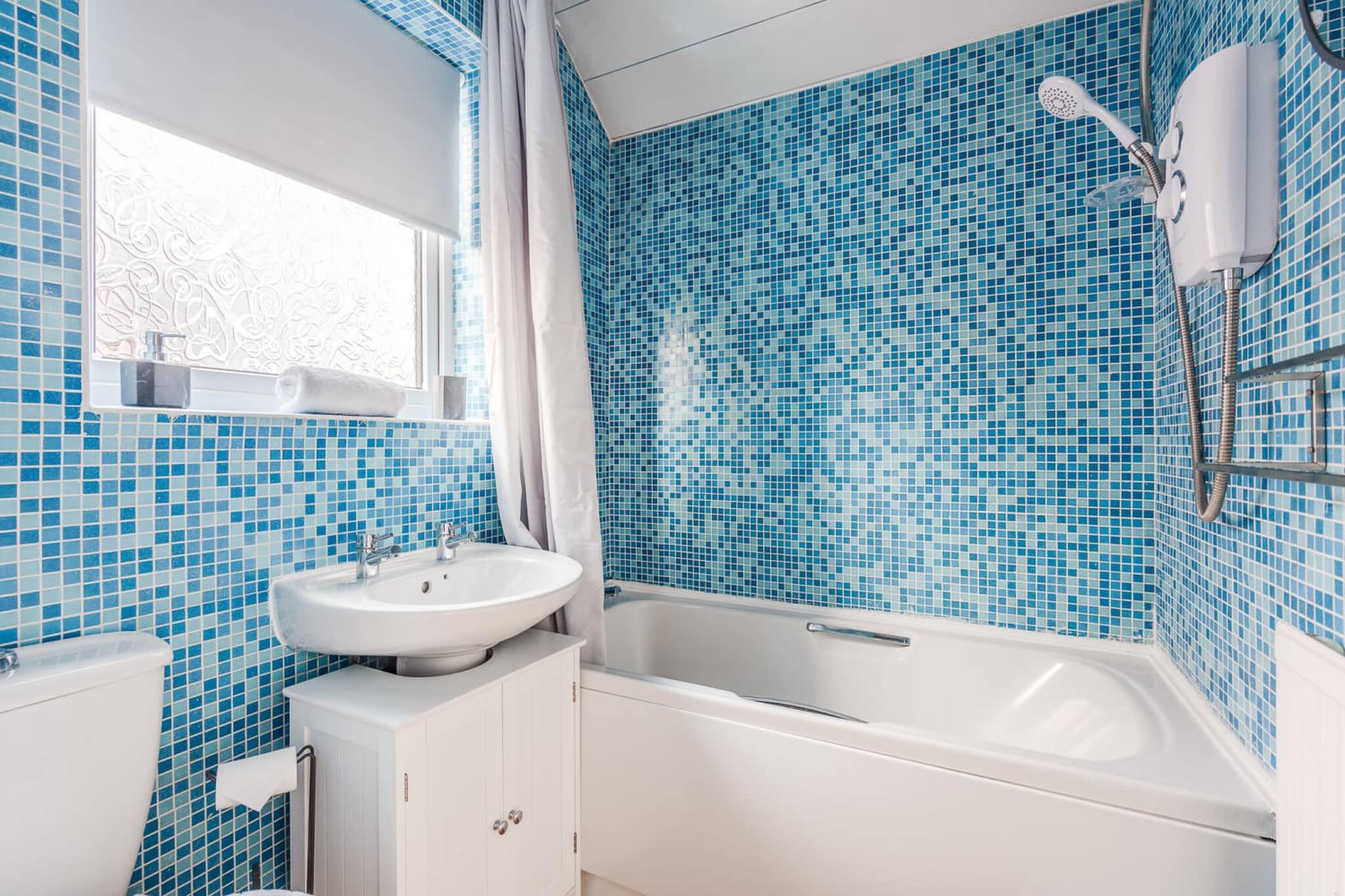 The bathroom has a bath, toilet, sink and over bath shower. It is a lovely shade of blue tiling.